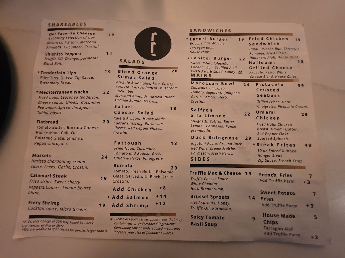 For those craving a hearty sandwich, the Eatori Burger and Capitol Burger are the stars of the Sandwiches section. If you're in the mood for something crispy and indulgent, the Fried Chicken Sandwich or the unique Halloumi Grilled Cheese are sure to satisfy.